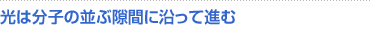 液晶に光を通すと、分子の並ぶ隙間に沿って、光が通ります。上の図のように分子の配列が90度ねじれている場合には、光も90度ねじれて通っていきます。