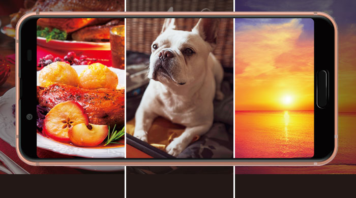2つのカメラが写真の魅力を加速させる。風景などをダイナミックに撮ることができる121°の広角カメラと、人物の表情や料理などを美しく表現できる標準カメラを搭載。撮りたいものに応じて自由に切り替えできます。