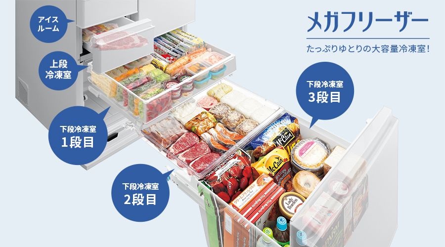 見やすく整理できるから、まとめ買いもさらに便利、大容量冷凍室メガフリーザー