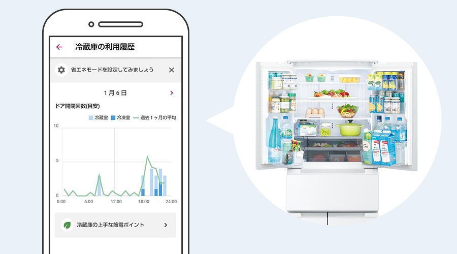 ドアの開閉をグラフで確認できます。節電サポートに役立ちます。