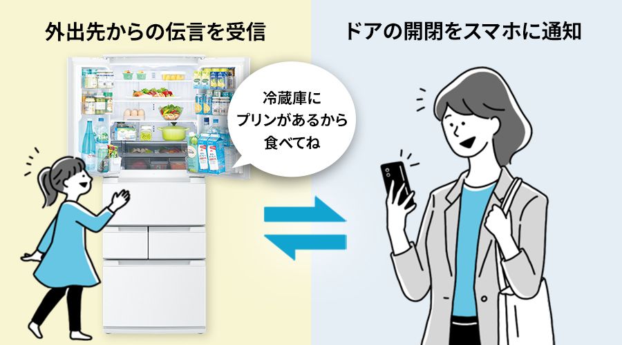 外出先から「COCORO HOME」アプリを通じて冷蔵庫に伝言を送信できます。ドアの開閉情報も確認できて便利です。