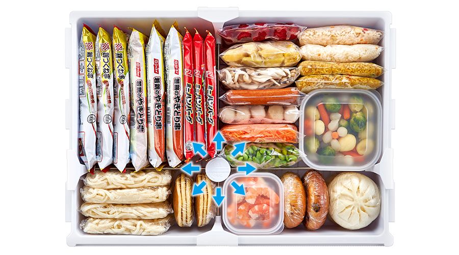 冷凍ケースを自由に仕切って、キチンと整理できる4切り(しきり)名人。タテ収納で収納量がアップし、使い忘れを防ぎます。