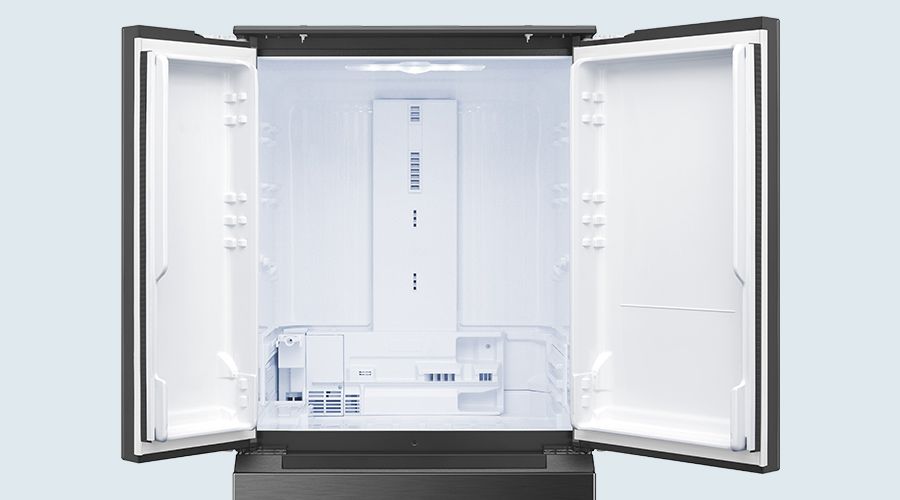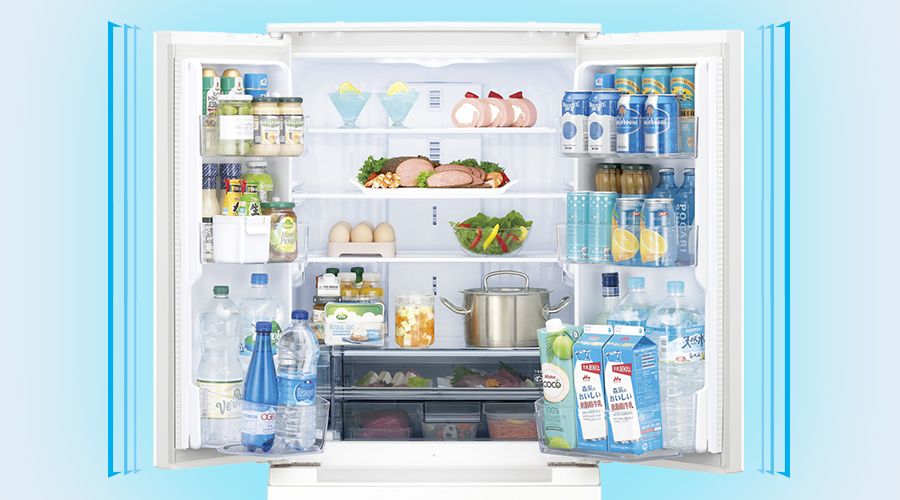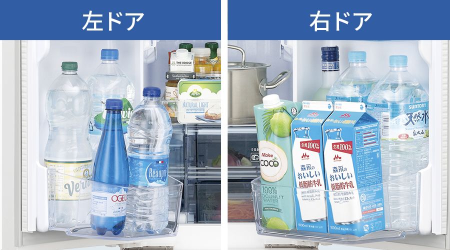 センターピラーとは、左右のドアの隙間を埋める柱。センターピラーがあるとドアポケットの収納スペースが狭くなりますが、シャープのフレンチドアは全てセンターピラーがない独自構造なので、ドアポケットも広々使えます。ドアの開け閉めも持つ場所を選ばないのでラクラク。