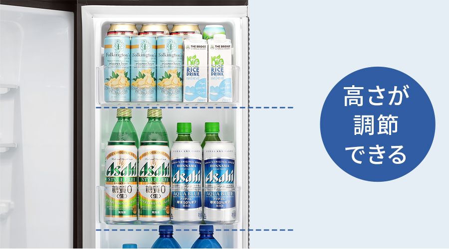 ビンやボトルの高さに合わせて、ドアポケットの高さが調節できます。