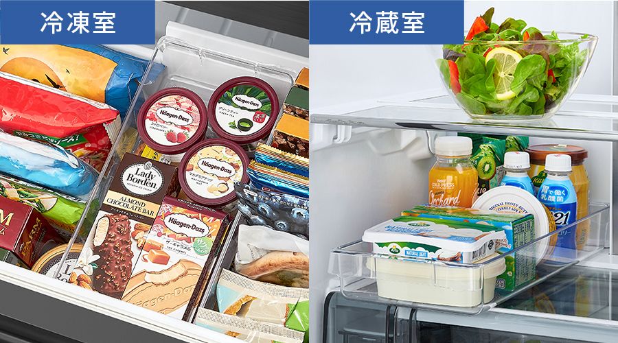 冷凍室に設置してあるフレキシブルトレーは、冷蔵室でも使えます。生活スタイルにあわせて小物をすっきり収納できます。