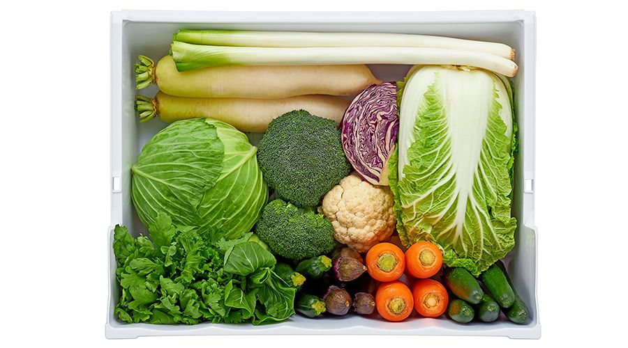 右側エリアには白菜のような大物野菜を、左側エリアにはキャベツやレタスを入れられます。横幅は長物野菜も余裕で入ります。手前には、にんじん、キュウリなど背の高い野菜が縦に収納できます。