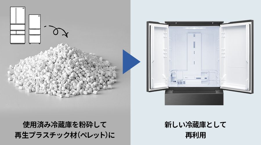 使用済みの冷蔵庫から回収したプラスチックを再利用したクローズドマテリアルリサイクルの取り組みにより、本体への再生プラスチック材使用率を従来機比※8約2.8倍にアップしています。