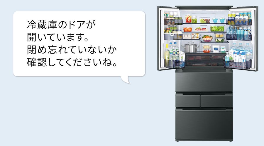 ドアを閉め忘れた時も、アラート音に加え、音声でもお知らせ。閉め忘れを手厚くサポートすることで、電気のムダ使いを抑えます。