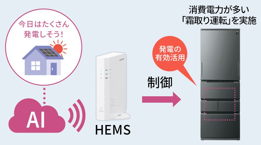 AIが予測した余剰電力量に応じて、冷蔵庫の霜取り運転を最適化。太陽光発電の電力を効率よく活用しながら、冷蔵庫を運転※3することで、電力のムダを抑えます。