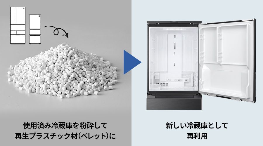 使用済みの冷蔵庫から回収したプラスチックを再利用したクローズドマテリアルリサイクルの取り組みにより、本体への再生プラスチック材使用率を従来機比※8約2.6倍にアップしています。