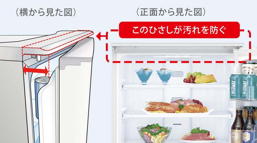 冷蔵室の上のひさしが、ホコリや油煙によるパッキンの汚れを防ぎます。
