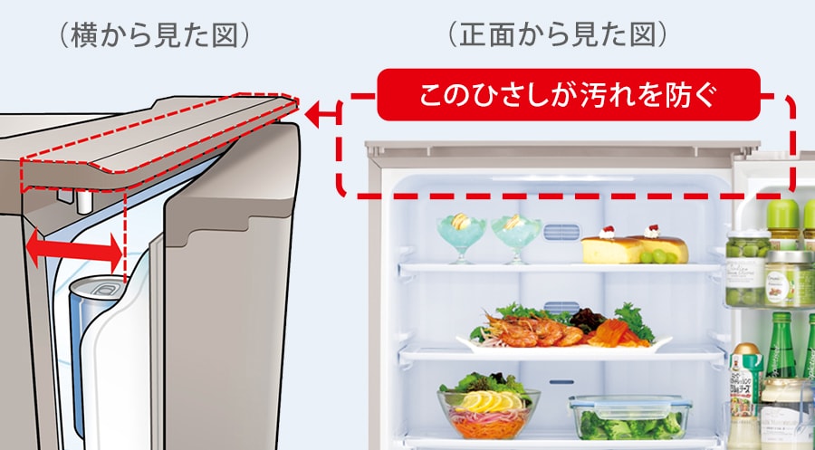 冷蔵室の上のひさしが、ホコリや油煙によるパッキンの汚れを防ぎます。