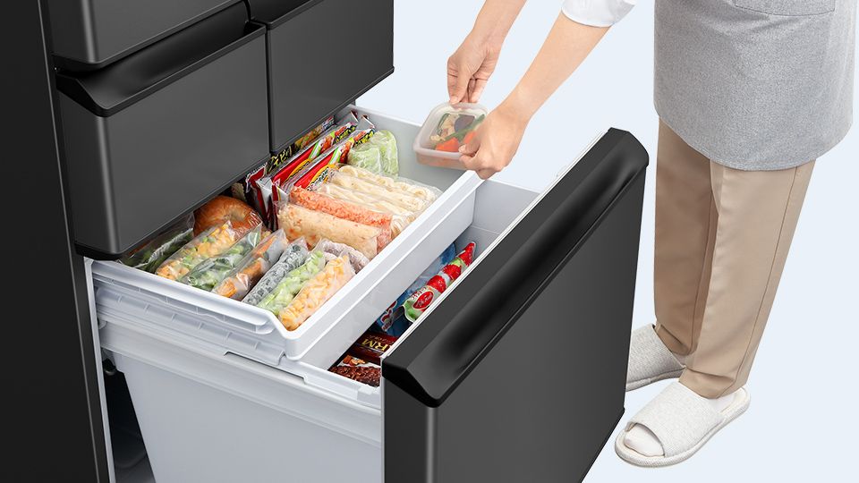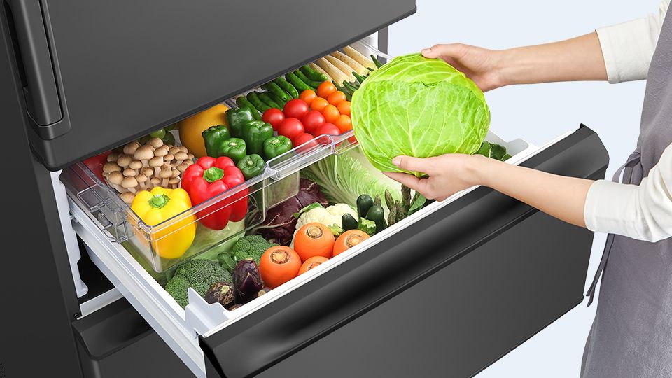 オートクローズどっちもドア、真ん中レイアウトシャキット野菜室、大小切替氷製氷