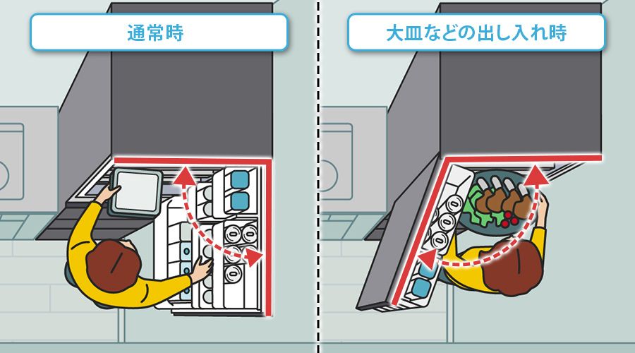 片開きドアだと動線が被ってぶつかることも…。「どっちもドア」なら動線が被らないので、ぶつからずスムーズに出し入れができます。