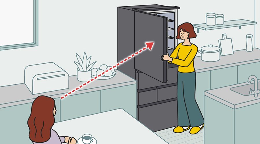 例えばキッチンから⾷材を、リビング‧ダイニングから飲み物を取り出す時、回り込むことなく近い⽅からサッと開閉。その時の⽴ち位置や動線により、左右どちらからでも⾷品を出し⼊れできます。