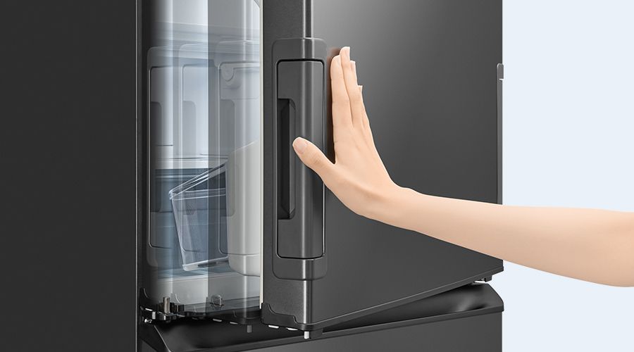 インテリアになじむやさしい質感。大きなラウンド形状のどっちもドアハンドル。ラウンディッシュシェルフやチルド棚の天板まで取りはずしができ、お手入れがラクに隅々までできます。