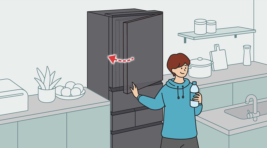 キッチンの壁ぎわに置いた冷蔵庫はドアの開閉スペースが⼩さくなりがちですが、「どっちもドア」なら壁ぎわの反対側にも開けられるため、⼤⽫料理の出し⼊れもスムーズです。