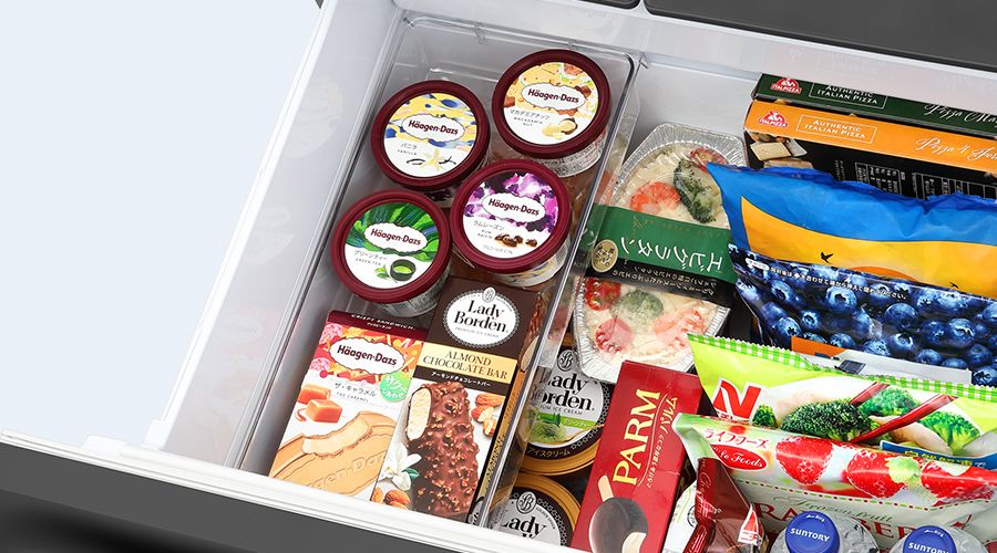 フレキシブルトレーは小分けにした食材やカップアイスクリームなどの収納にも便利に使えます。