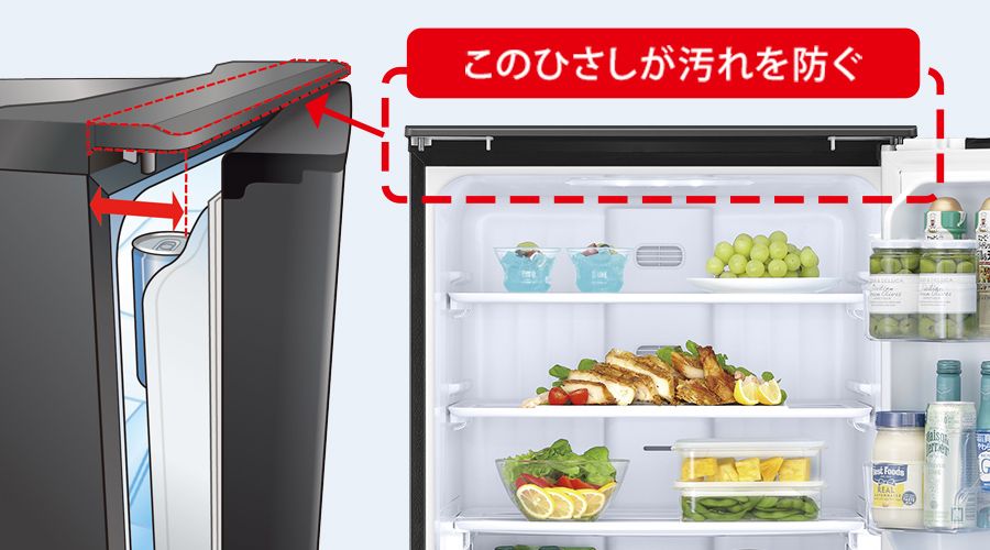 冷蔵室の上のひさしが、ホコリや油煙によるパッキンの汚れを防ぎます。