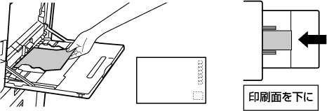 手差しトレイに郵便はがき、往復はがきおよび封筒をセットする場合は、それぞれ図のような向きでセットします。