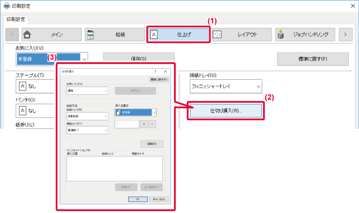 プリンタードライバー設定画面[挿入]タブの「挿入機能」で[インデックス紙]を選択し、タブ部分にプリントする文字列を入力します。タブ部分の大きさや開始位置、次のタブまでの間隔、インデックス紙を挿入するページ番号など、詳細な設定をします。