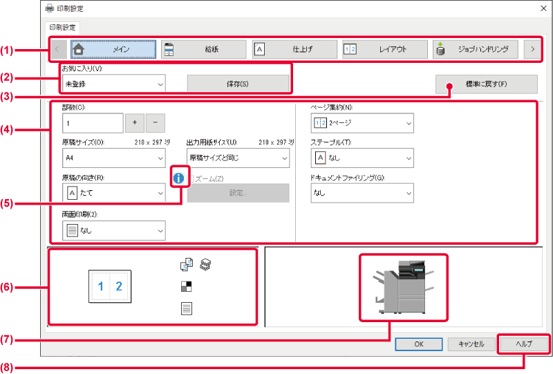 [レイアウト]: 両面印刷や製本などレイアウトに関する機能を設定します。