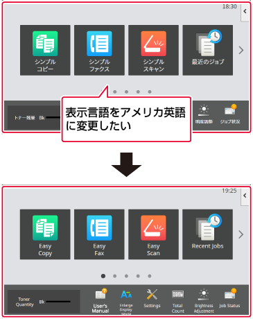設定内容が本機に登録され、設定が有効になります。コピーやイメージ送信などのノーマルモードの画面で、文字の表示や間隔を大きくすることができます。この機能は、タッチパネルで行います。