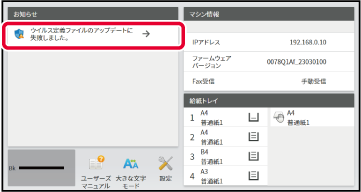 システム情報画面の「お知らせ」にウイルス検知のメッセージを表示します。 |