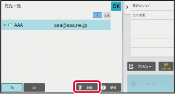 「指定した送信先を一覧表示」の手順2で、宛先を選択して[削除]キーをタップします。