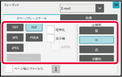 のときは、右横の数字のページ数毎にファイルを作成します。チェックを外した場合、全ページを1ファイルで作成します。インターネットFaxモード時のフォーマットは、システム設定で行います。