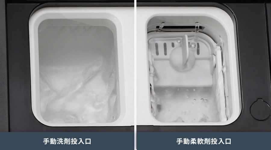 洗剤・柔軟剤の手動投入口も自動洗浄