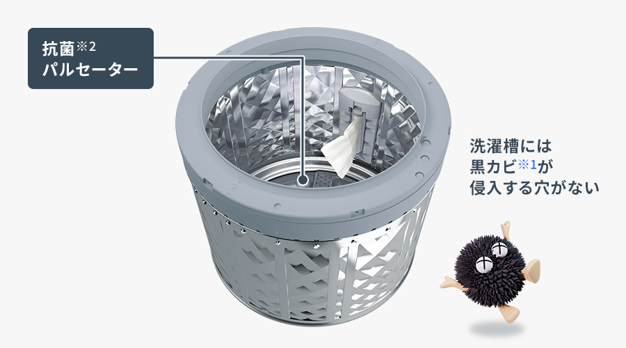 洗濯槽は、底裏までがステンレス。さらに洗濯槽に穴がないから、槽内に黒カビ※1や汚れが侵入するのを防ぎます。洗濯物に直接ふれるパルセーターは、Ag+抗菌・防カビ加工※2。清潔な水で洗い・すすぎができる清潔仕様です。