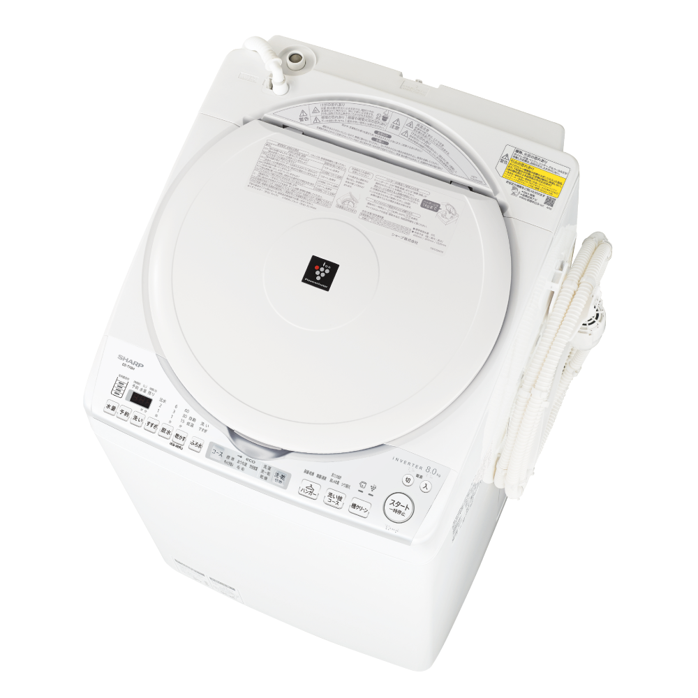 - ※5● 試験機関:(一財)ボーケン品質評価機構 ● 試験方法:菌を付着させた試験布をハンガー除菌・乾燥コースで運転させた際の菌の減少率を測定 ● 除菌方法:プラズマクラスターおよび温風乾燥方式 ● 対象部分: 洗濯槽内の衣類 ● 試験結果:60分で99%以上抑制 ● イオン濃度:約350,000個/㎤(洗濯槽中央部で測定)。● 試験機種:ES-TX8E(2020年度、ES-TX8Hと同等)