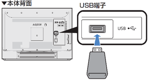 本機のUSBメモリー端子に、更新用ソフトウェアを書き込んだUSBメモリーを取り付けます。