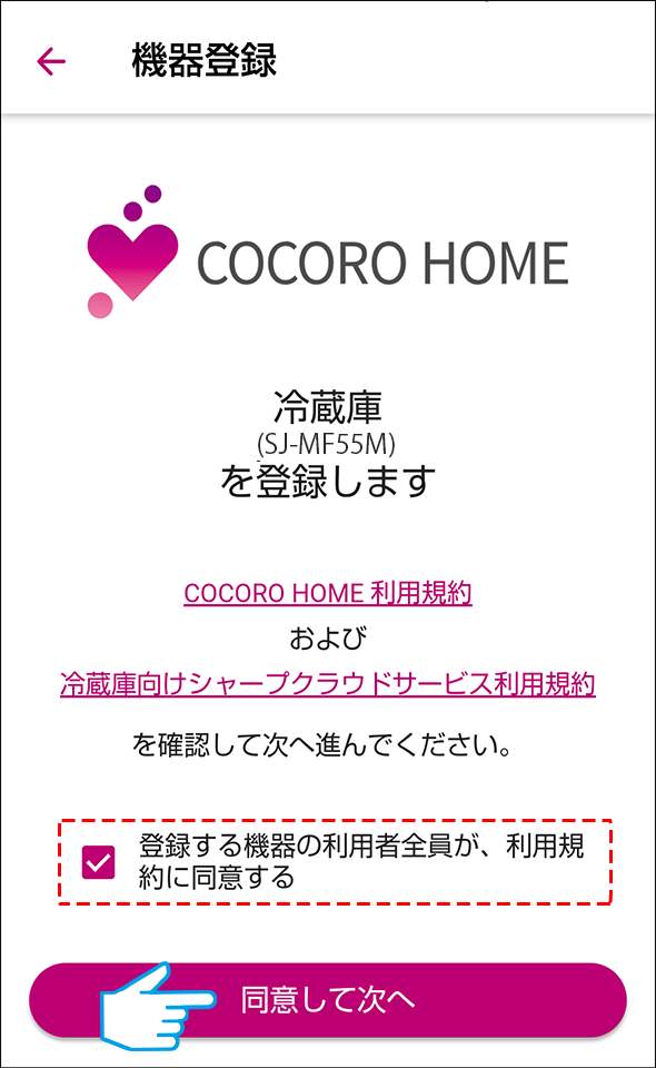 2.【スマートフォン】COCORO HOMEアプリ利用規約および冷蔵庫向けシャープクラウドサービス利用規約を確認し、