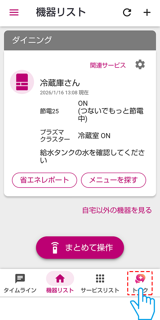 1.COCORO HOMEの「トーク」をタップし、機器を選ぶ