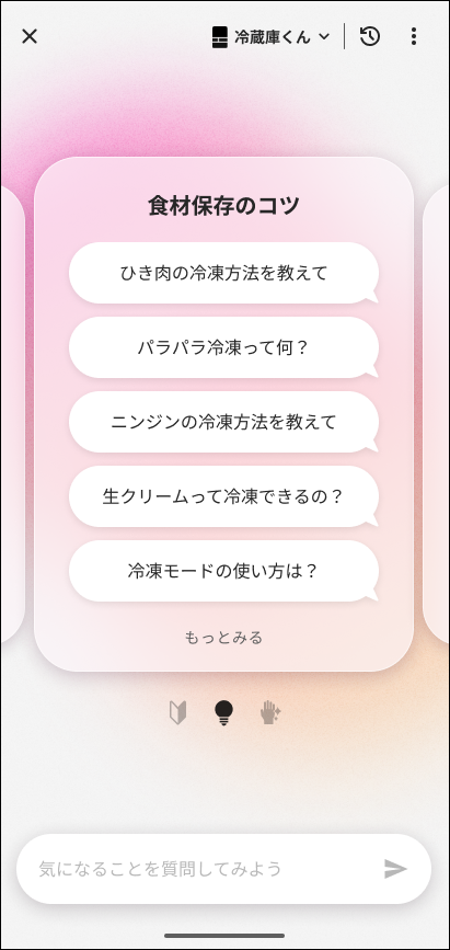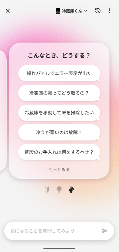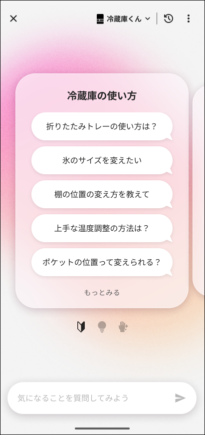 タップした項目に応じてAIが回答します。「もっとみる」をタップすると、より多くの質問・相談例を見ることができます。