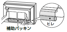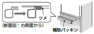■本体側補助パッキンを庫内の上側手前のツメにはめ込む※下図は冷凍室(下)
