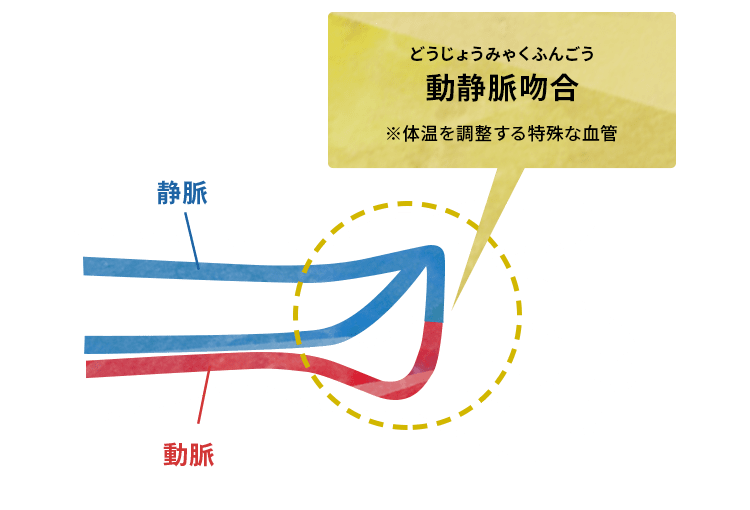 - ※動静脈吻合(どうじょうみゃくふんごう:Arteriovenous Anastomoses(AVA)体温を調整する特殊な血管)