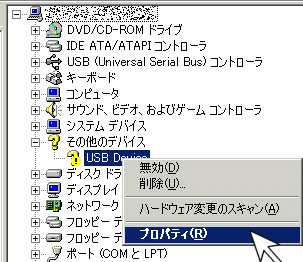 「USB Device」の上で右クリックし、表示されたメニューから「プロパティ(Rを選んでください。