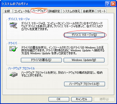「システムのプロパティ」画面が表示されたら[ハードウェア]タブをクリックし、[デバイスマネージャ]ボタンをクリックします。